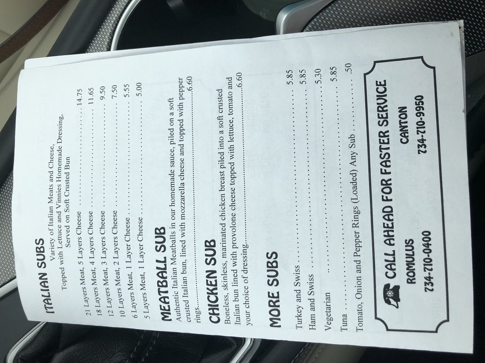 Introducing Vinnie’s Italian Sub Shop, a hidden gem for sandwich lovers in Romulus, MI. With a variety of vegetarian options, including the popular Italian sausage and turkey Swiss sandwiches, Vinnie’s offers a diverse menu with fresh and tasty ingredients. Customers rave about the friendly service and the value for money, with favorites like the 21 meat layer sandwich and the original sub standing out. The atmosphere is described as cozy, with a fun bar and a welcoming community of regulars. Whether you're in the mood for a classic cheese steak or a flavorful chicken sub, Vinnie’s has something for everyone. Don't miss out on this East coast-approved spot for delicious Italian fare.